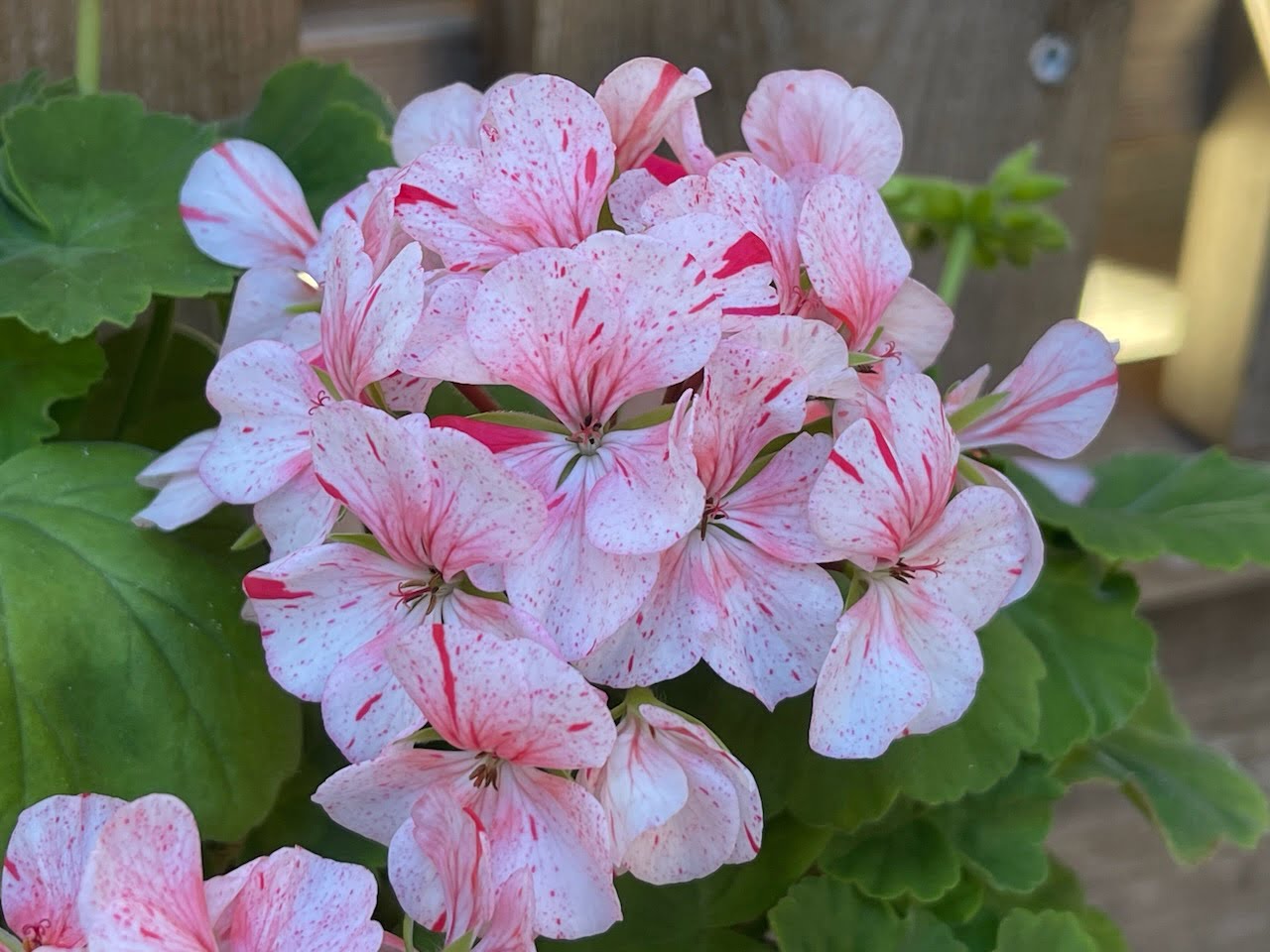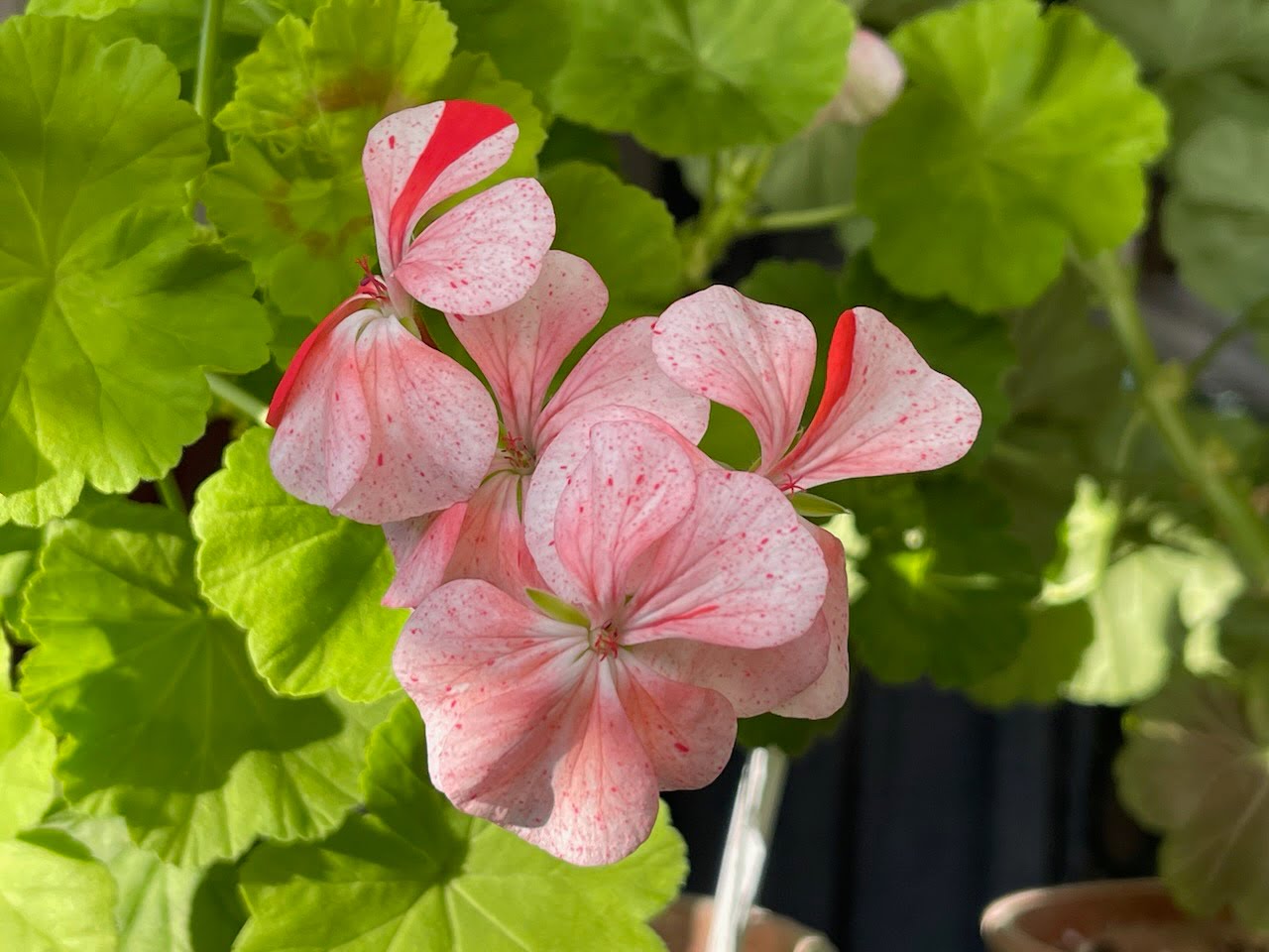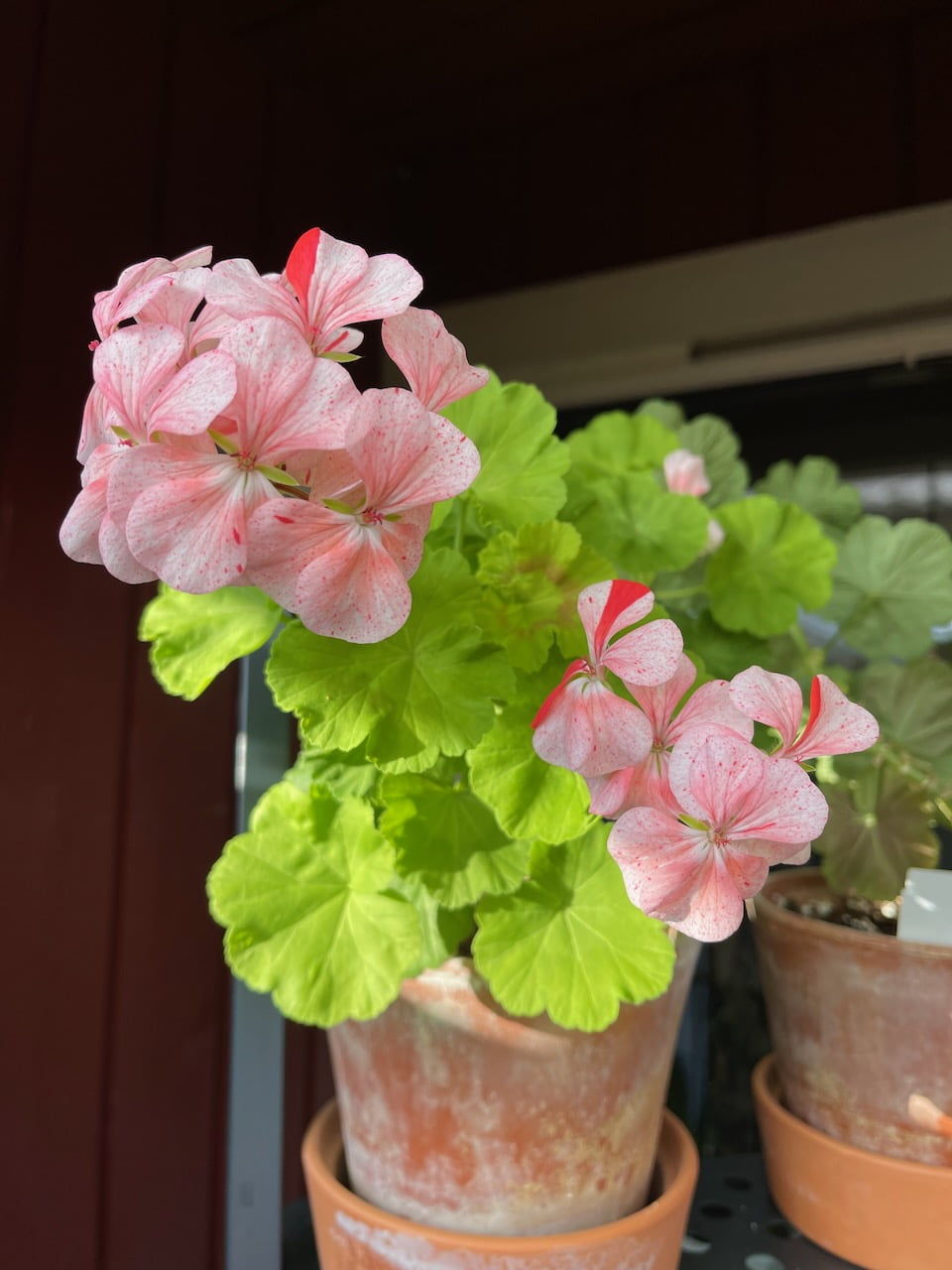 Pelargoniastikling Hovedgruppe: Zonalpelargonia Gruppe: Eggskallspelargonia Blomst: Enkle, rose blomster med røde prikker Blad: Lyst grønne Foredler: Frøkryssning fra Brian West, tatt frem av Lotta Lundberg Pottestørrelse: 9 cm