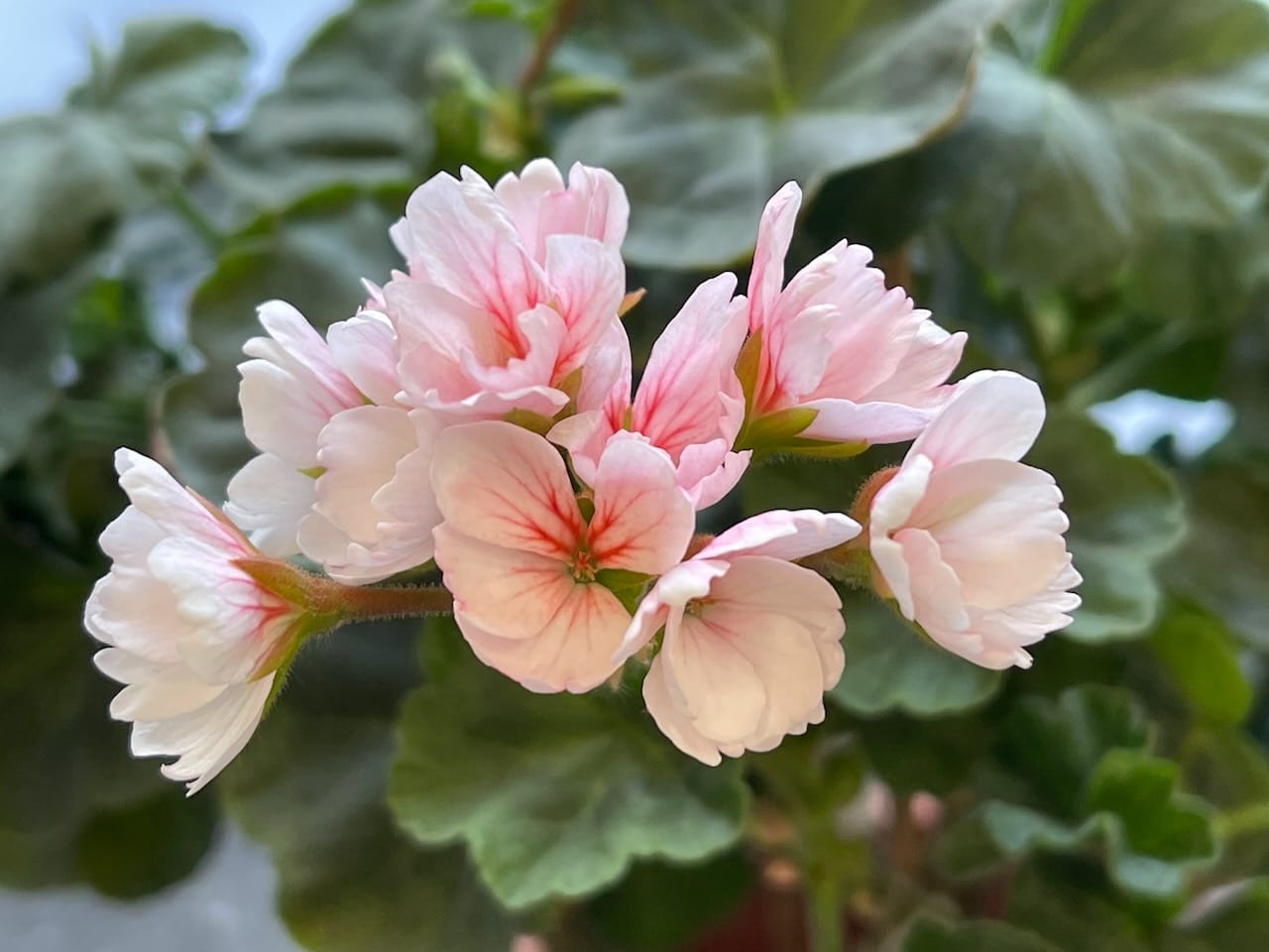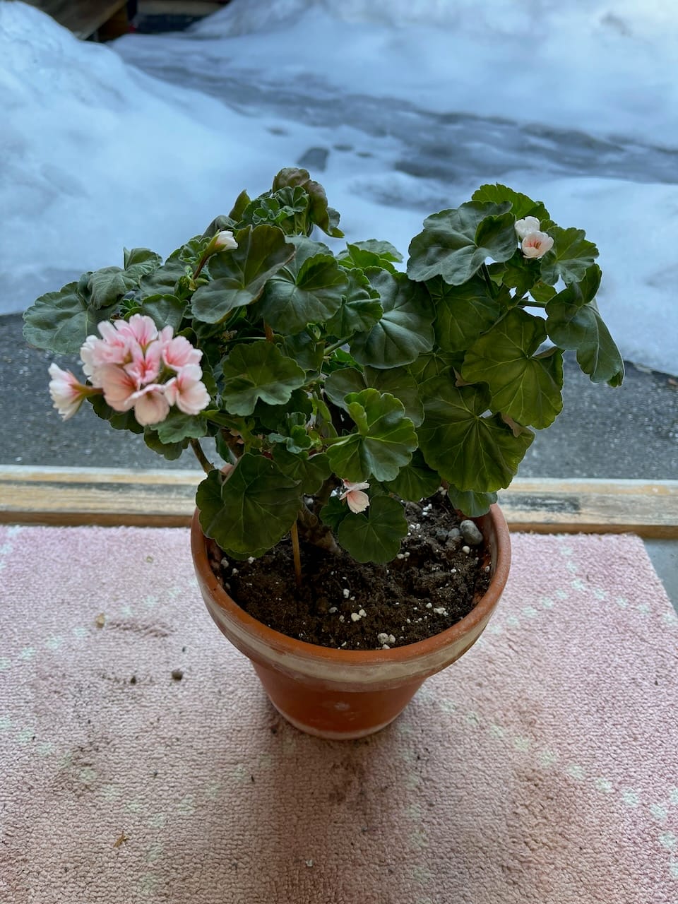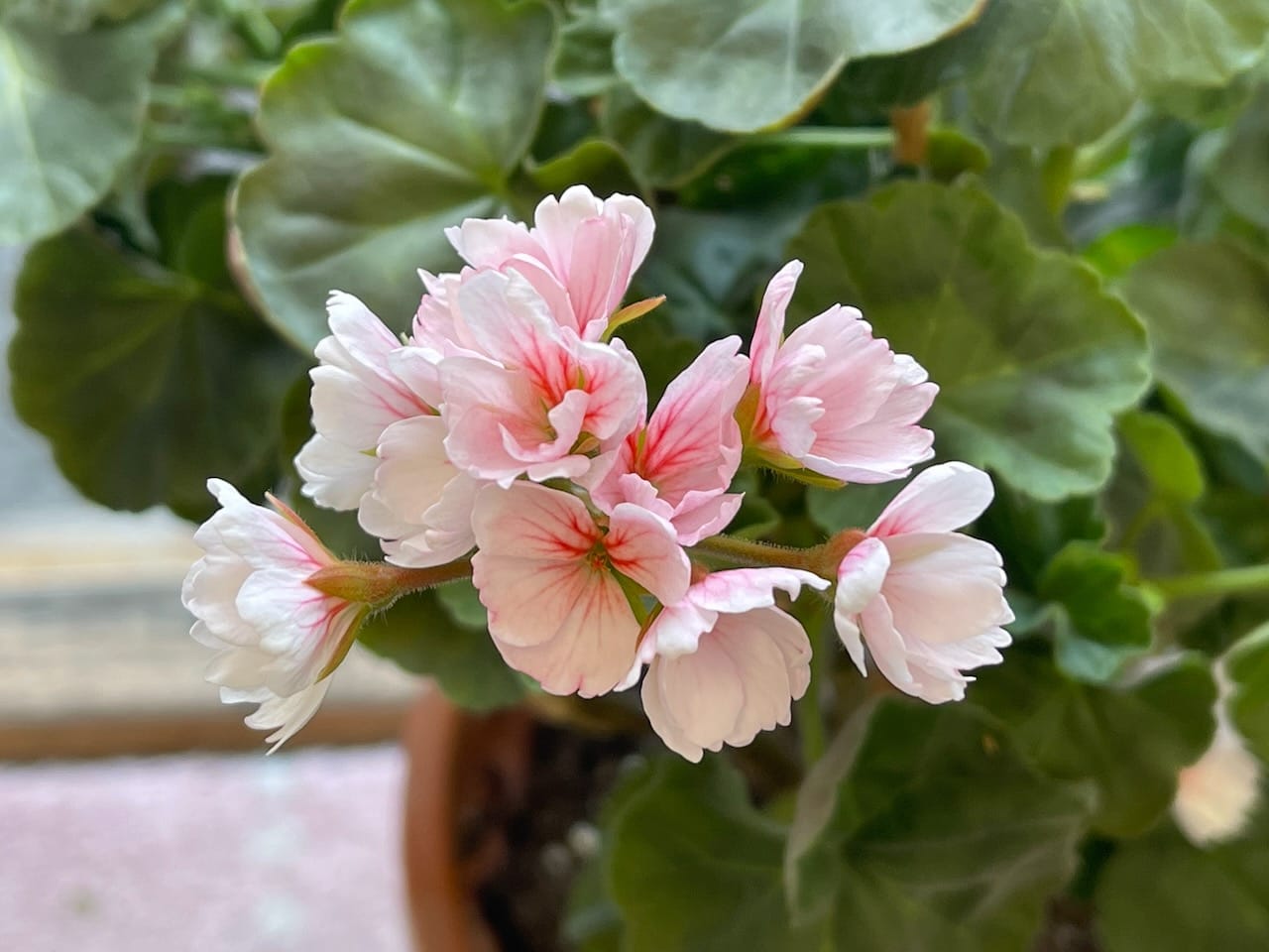 Pelargoniastikling Hovedgruppe: Zonalpelargonia Gruppe: Nellikblomstrende Blomst: Enkle, hvite blomster med rosa midt. Blir rosa hvis den står ute i solen Blad: Glatte, mellomgrønne Foredler: Victor Lemoine, 1904 Pottestørrelse: 9 cm